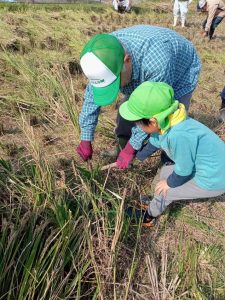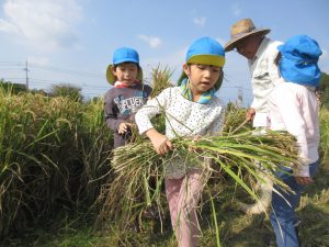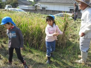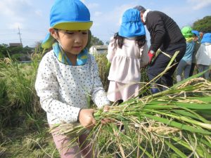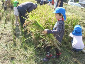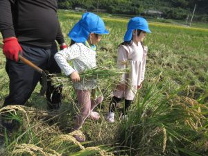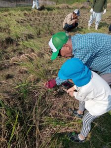服装を稲刈り用の服に着替えて、さくら組(5歳児)・ひまわり組(4歳児)が参加してきました😊
