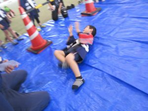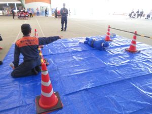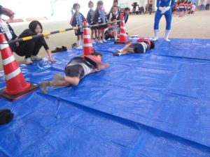 『服に引火した時に、火を消火する為に床へ転がって引火を止めること』を真似て転がってリレー