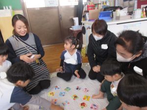 握手をしたりふれあい遊びをしながら、お互いに少しずつ緊張を解き…